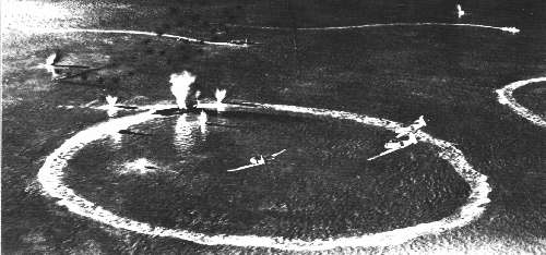 At daybreak, the two cruisers were protected by two destroyers, slowly making way out of Midway's range. But they were too slow, and Kurita's order to have Mikuma stand by her sister now endangered both vessels. Midway SBDs and Vindicators began their attacks at 0745, scoring no hits, but probably a plane crashed on Mikuma. B-17s followed, scoring nothing, but the heavy cruisers were slowed down. By the next day, planes from Enterprise and Hornet found the enemy and struck repeatedly, sinking Mikuma and knocking Mogami out of the war for a year.